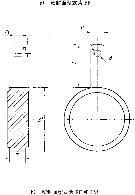 b)对于公称直径大于QN25,密封面型式为FF、RF和LM,公称压力为尸N20 (CLASS 150)和 PN50(CLASS300)的8字盲板和单垫环,孔的尺寸与管子的外径相同;