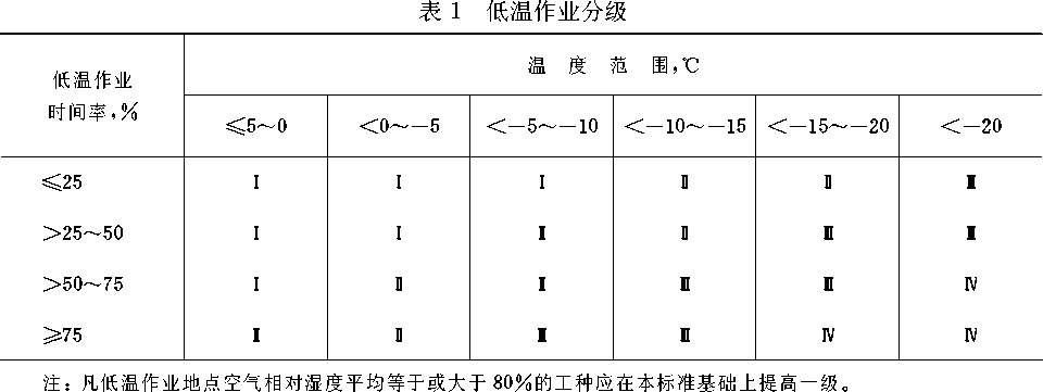 按工作地点的温度和低温作业时间率,将低温作业(按表1)分为四级,级别高者冷强度大O