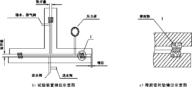 利用模拟管片“T"形、"一”形拼装接缝的耐水压试验装置,测定密封垫在设计错位量和张开量时能 承受的水压值。