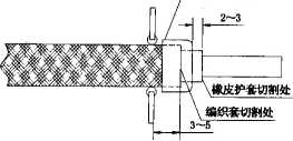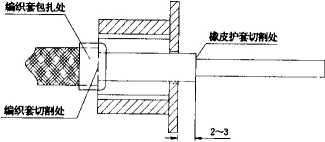 d)用塑料胶带半迭包扎到与橡皮护套齐平,在接头端应露出长度为2 mm的黄蜡绸。