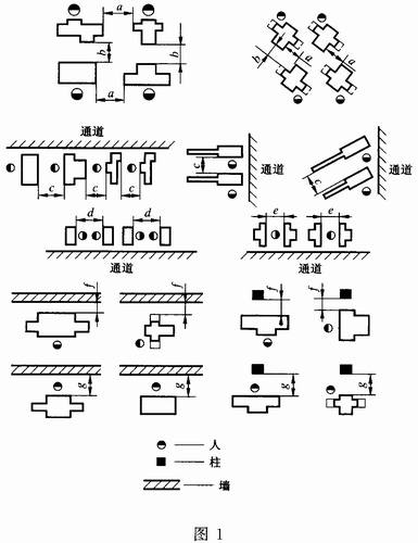 两排机床均背向或侧向通道(见图3 a) 一排机床背向通道,另一排机床面向通道(见图3 b) 两排机床均面向通道(见图3c) |