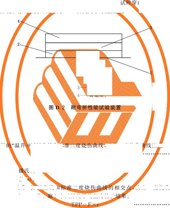 如图D. 1所示,试验装置中辐射热源的辐射热通量范围5 kW∕m2-50 kW/n?。燃烧热源的热通 量范围20 kW∕m2-80 kW∕m2 o采用铜-康铜(T型)热电偶焊接在铜板上制成铜板热量计,其中铜板尺 寸为50 mm× 50 mm,厚度为1. 6 mm,质量为36 g÷0. 1 g0热电偶直径为0. 3 mm0绝热块采用不燃 的绝热材料制成,试样夹盘和配重物采用不锈钢材料,试样夹盘、绝热块和配重物质量的总和应为 1 000 g+10 go热电偶后端连接温度显示装置。温度显示装置应能够绘制试样内表面“温升-时间”曲线。