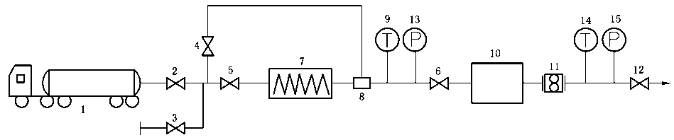 a) 液氮从槽车里输出后分为两路,一路经气化器气化为氮气,另一路保持液态,两路介质在混合 器里混合,混合后的低温氮气流向加液装置入口管道;
