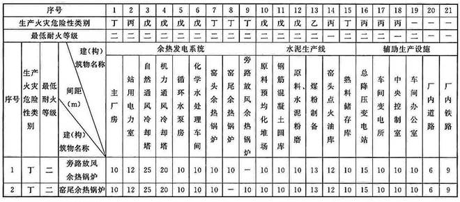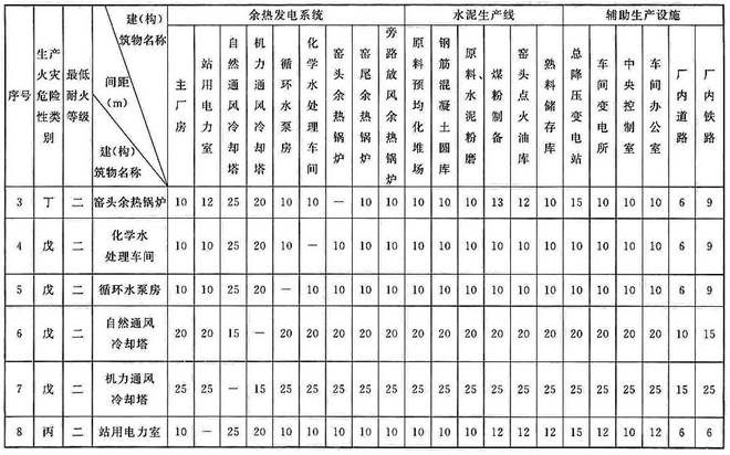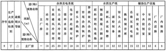 5.1.5 建(构)筑物的耐火等级及最小防火间距应根据生产过程中的火灾危险性确定,各建(构)筑物之间的最小防火间距应符合现行国家标准《建筑设计防火规范》GB 50016、《水泥工厂设计规范》GB 50295的有关规定,并应满足本标准附录A的规定。