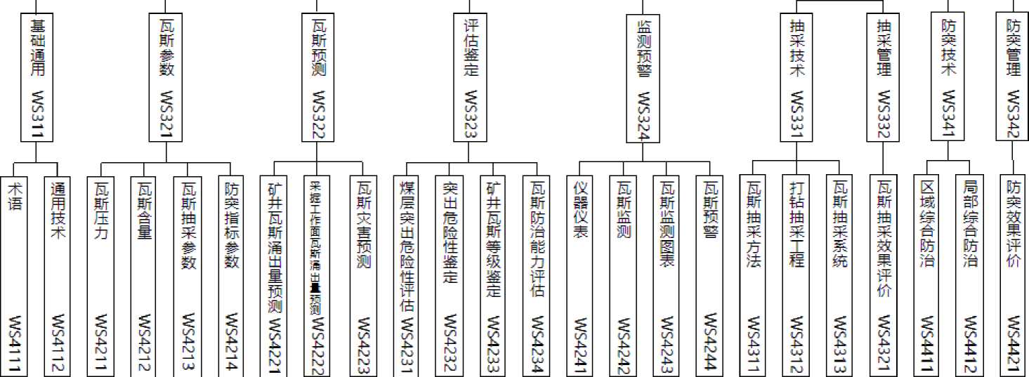 标准子体系由四个层级组成。第一层级为瓦斯防治,第二层 级包括基础通用、测试评估、瓦斯抽采、突出防治。第三层级和 第四层级按照对象、流程、类型等维度,进一步明确了各专业门 类范围内的标准分类。瓦斯防治标准子体系整体架构如图1 所示。