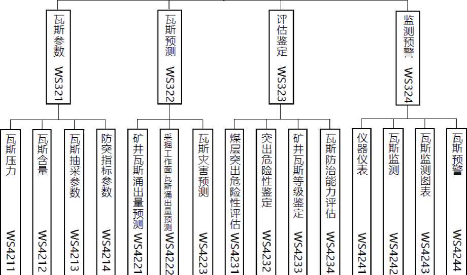 测试评估标准分为瓦斯参数、瓦斯预测、评估鉴定、监测预 警4个类别,如图3所示。其中,瓦斯参数类别分为瓦斯压力、 瓦斯含量、瓦斯抽采参数、防突指标参数等;瓦斯预测类别分为 矿井瓦斯涌出量预测、采掘工作面瓦斯涌出量预测、瓦斯灾害预 测等;评估鉴定类别分为煤层突出危险性评估、突出危险性鉴定、 矿井瓦斯等级鉴定、瓦斯防治能力评估等;监测预警类别分为仪 器仪表、瓦斯监测、瓦斯监测图表、瓦斯预警等。