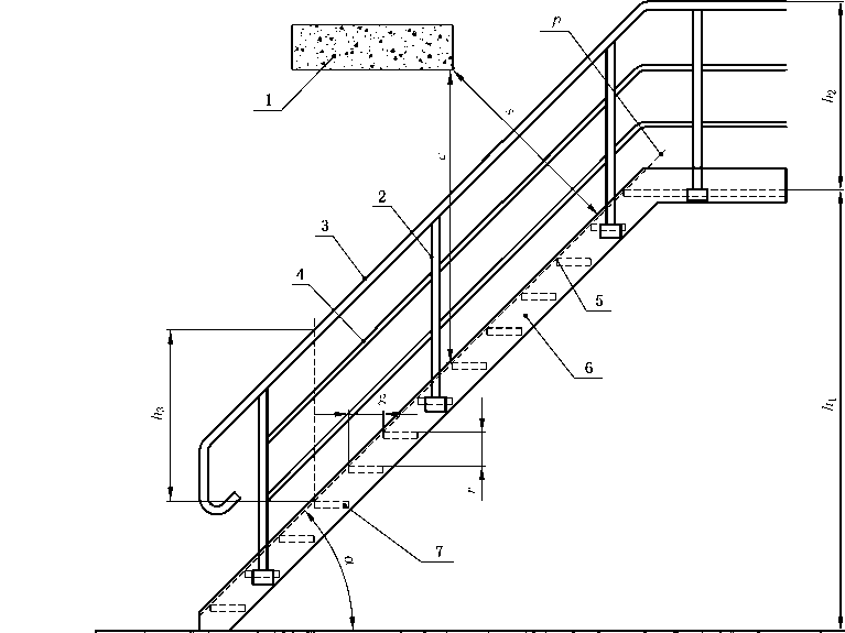 图6倾角大于45°的斜梯顶部横杆(扶手)起点示意图