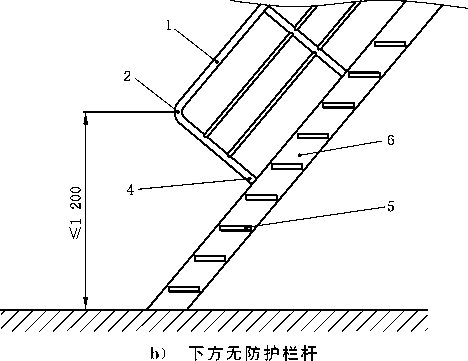 b) 下方工作面或梯间平台无防护栏杆时,起点距离工作面或梯间平台的竖向距离应不大于1200mm [见图6b)]。