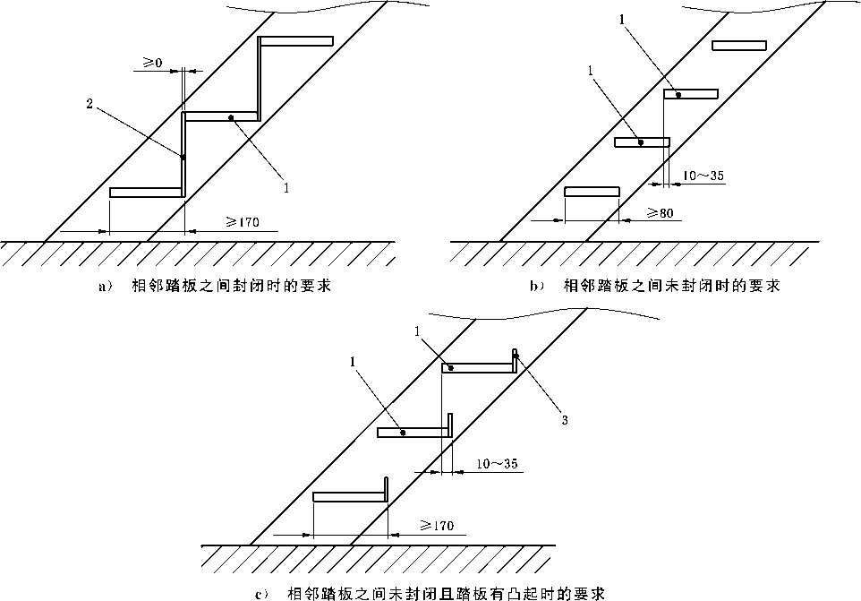 b) 相邻踏板之间未封闭时,重叠长度应为10mm~35mm[见图5b)和图5c)]。